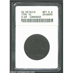 1794 1C Head of 1794--Corroded--ANACS. VG Details, Net Good 6. S-69, R.3. There is appreciably more definition on the obverse of this more affordable representative of the scarce S-69 die marriage. The recesses are a little dark on both sides, but scattered pitting and incrustation is largely confined to the obverse. Important notice: We expect to be auctioning lots at the rate of 200-250 per hour. Sometimes eBay Premier live bid software cannot keep up with that pace, so we strongly recommend that you place a realistic proxy bid now as insurance to avoid disappointment. Also please note that all Heritage/CAA lots purchased through eBay Premier carry a 20% Buyer's Premium. Please make sure you read the Terms and Conditions.