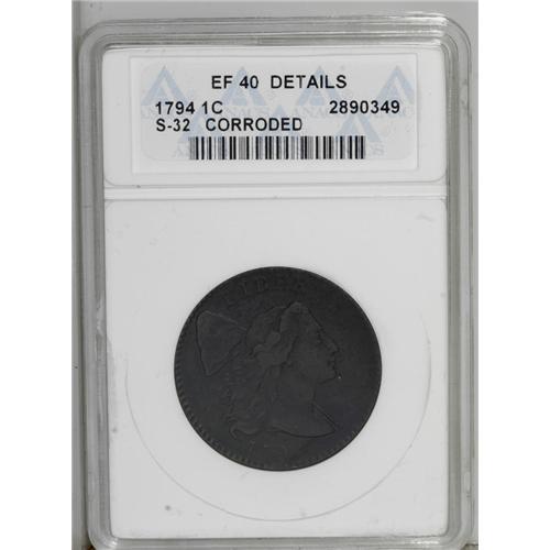 <B>1794<1C> Head of 1794--Corroded--ANACS. XF40 Details.</B></I> S-32, B-18, R.2. This dark example has sharp details, particularly within Liberty's hair. Moderately granular, but void of relevant marks. EAC 12.