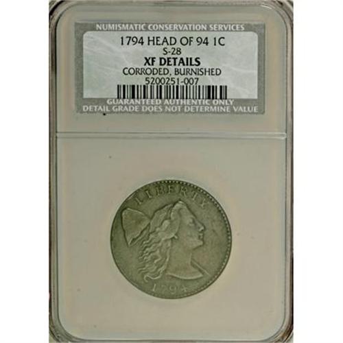 <B>1794 1C Head of 1794--Corroded, Burnished--NCS. XF Details.</B></I> S-28, B-10, R.2. The chocolate-brown surfaces of this second-year cent show atypical gloss that does little to disguise evidence of corrosion in the fields. Despite these flaws and a handful of rim bumps, the coin retains a measure of eye appeal. EAC 15.<BR><BR><B>Coin Engraver:</B> Joseph Wright<BR><BR><b>Shipping:</b> Coins & Currency (<a target="_blank" href="http://www.heritageauctions.com/common/shipping.php">view shipping information</a>)