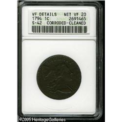 <B>1794 1C Head of 1794--Corroded, Cleaned--ANACS. VF Details, Net VF20.</B></I> S-42, Low R.4. STATES OF and the date are somewhat weak, but the remaining legends are bold and the devices are crisp. A porous example with maroon and aquamarine colors. Lot:5107