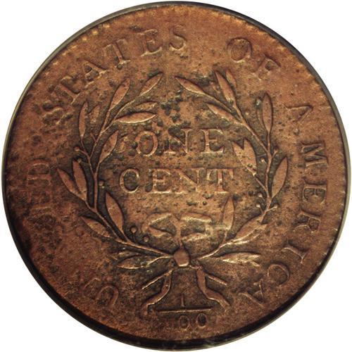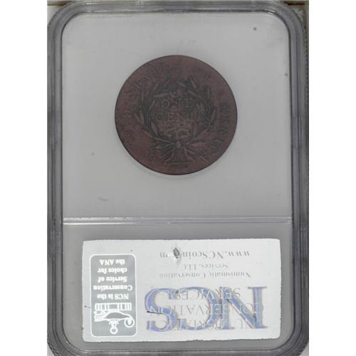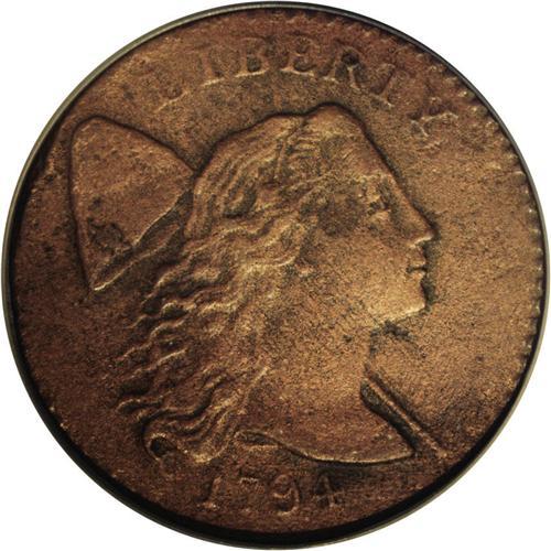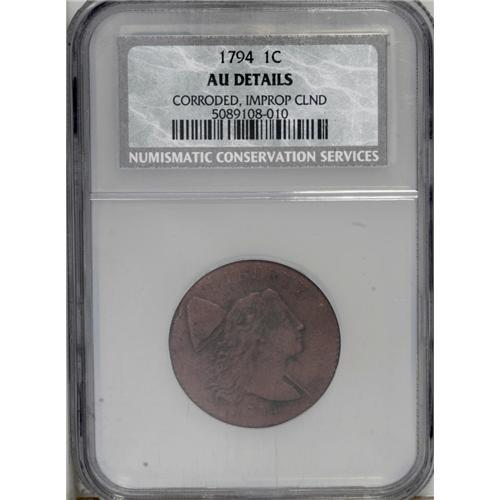 <B>1794<1C> Head of 1794--Corroded, Improperly Cleaned--NCS. AU Details.</B></I> S-31, B-13, R.1. A well defined piece that only shows weakness of detail on UNITED. The brick-red color is unnatural, and the piece has been brushed to remove verdigris. The surfaces are granular, and the central reverse is pitted. EAC 12.