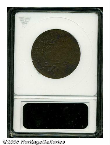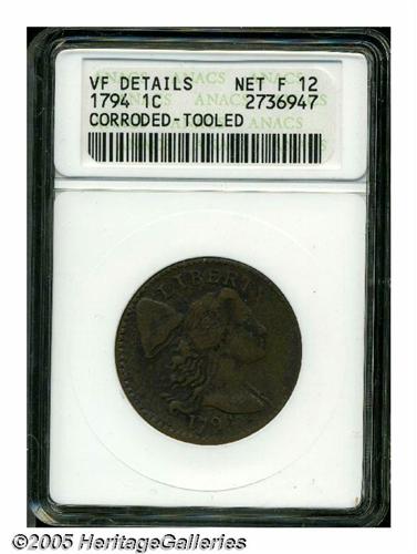 <B>1794<1C> Head of 1794--Corroded, Tooled--ANACS. VF Details, Net Fine 12.</B></I> S-54, R.3. Tan-brown color competes for territory with deeper and slightly granular lilac hues. Some faint pinscratches are present from an attempt to remove verdigris. A few moderate marks are on Liberty's cheek and neck.