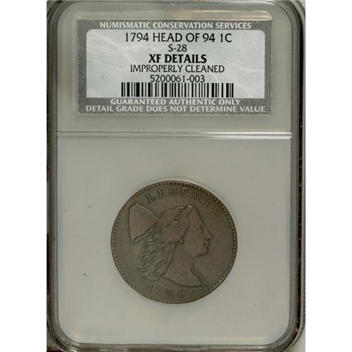 <B>1794 1C Head of 1794--Improperly Cleaned--NCS. XF Details.</B></I> S-28, B-10, R.2. Breen Die State II. This evenly defined golden-brown piece is faintly hairlined throughout, but there are no individually mentionable marks. EAC 20.<BR><BR><b>Shipping:</b> Coins & Currency (<a target="_blank" href="http://www.heritageauctions.com/common/shipping.php">view shipping information</a>)