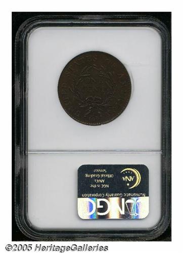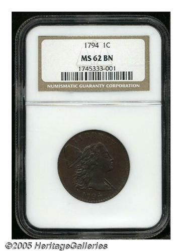 <B>1794<1C> Head of 1794 MS62 Brown NGC.</B></I> S-22, R.1. An earlier die state with no trace of the mounds above ONE, as usually seen. This common variety is most easily attributed by the sharply bent sixth lock of Liberty's hair on the obverse, and the left ribbon being severed from the knot. EAC net graded AU50 by Del Bland, and considered to be firmly in the Condition Census for the variety. The surfaces have a very pleasing glossy brown sheen and there are no noticeable or detracting marks other than a few scattered tiny planchet flakes on the lower half of the obverse, and a near-vertical mark by the U in UNITED.<BR><I>From Europe to Thomas L. Elder, February 1921, lot 1911; 1974 ANA (Paramount, 8/74), lot 308; Chuck Furjanic; Bowers and Ruddy Galleries FPL (1975); American Auction Association (12/75), lot 271; Bowers and Ruddy Galleries (10/76), lot 1487; unknown intermediary; Bowers and Merena (3/84), lot 613; Gene Sanders (Coinko); Jonathan Gordon; Superior Galleries (5/91), lot 23; Dr. Thomas Turassini; Eric Streiner; 4/24/93 to Thomas D. Reynolds; 10/6/97 to Dr. John D. Wilson.</B></I>