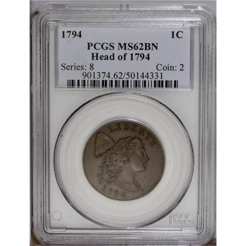 <B>1794<1C> Head of 1794 MS62 Brown PCGS.</B></I> S-28, High R.2. Die State IV. An exceptionally pleasing 1794 cent. Struck on a tight, smooth planchet that shows almost no porosity. Just a couple of isolated areas of porosity are seen around the margin of the reverse. It is believed that 15,000 S-28 cents were struck on March 5-7, 1794. The striking details are exceptionally strong on the obverse with only minor weakness on the reverse. While labeled by PCGS as a brown coin, there is a considerable presence of mint red still in evidence just beneath the light overlay of brown. A small mark is located near the obverse rim at 3:30, and there is a tiny dig over the R in AMERICA on the reverse. A superior example of this variety. EAC 50 <BR><BR><B>Important notice:</B> Heritage usually auctions material at the rate of 200-250 lots per hour. On some occasions eBay Live bid software or the Internet may not be able to keep up with the pace of the auction. We recommend placing a realistic absentee bid now as insurance to avoid disappointment. Occasionally the auctioneer may eliminate or reject an eBay Live bid, and the auctioneer may also reopen a lot after the close of the eBay live bidding (usually because we missed an audience bid), and may reject your bid even if it shows you as the winning bidder. By bidding via eBay Live, you agree that Heritage may award the lot to another bidder at its sole discretion under the circumstances described above or any other reasonable circumstances. Since eBay bids are not shown to us until we open the lot on the floor, we treat those bids just like floor bids. In most cases the floor responds before the eBay bid is presented to us, due to Internet lag time, so for consistency we have made it a policy that floor bids are always considered first over tie eBay live bids. Also please note that all Heritage lots purchased through eBay Live carry a 20% Buyer's Premium. Please make sure you read the Terms and Conditions before you bid. This lot is being auctioned in conjunction with a live floor auction by Heritage Galleries & Auctioneers. All final auction and invoice information will be supplied by Heritage Galleries & Auctioneers, and all other information should be considered preliminary. Lot:241 <BR><BR><B>Winning Notification and Billing:</B> After the FINAL session in this auction is complete, Heritage will send e-mail and snail mail invoices. This process normally takes several days. All final auction and invoice information will be supplied by Heritage Galleries & Auctioneers, and all other information should be considered preliminary. <BR><BR>This auction will be conducted on a live auction floor and over the Internet through eBay Live. If you choose to place an absentee bid, please take a moment to <font color='#0000ff'><u><a href='http://pages.ebay.com/liveauctions/help/before/laabsentee.html'>learn how eBay Live absentee bidding works</a></u></font><font color='#000000'>