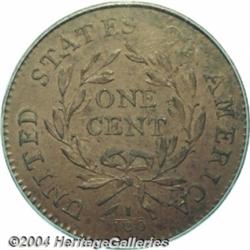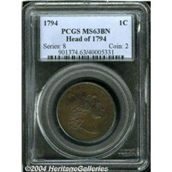 <B>1794<1C> Head of 1794 MS63 Brown PCGS.</B></I> S-28, High R.2. Maris' "Ornate Variety," which has a full, rounded cheek of Liberty and hair that terminates in eight distinct points of "excellently proportioned length," according to Henry Chapman. Well struck aside from OF and the far right obverse field. Chocolate-brown patina occasionally cedes to medium lavender hues. There is a faint mark on the cheek and a couple of small planchet flaws (as produced) on the upper right reverse, but the surfaces are otherwise smooth. There are faint clash marks (as made) visible on the left interior of the wreath, and close inspection reveals a network of faint die cracks on the obverse field. This lovely second year Large Cent is certainly a candidate for the Condition Census. Population: 5 in 63, 9 finer (7/04). <BR><BR><B>Important notice:</B> Heritage usually auctions material at the rate of 200-250 lots per hour. On some occasions eBay Live bid software or the Internet may not be able to keep up with the pace of the auction. We recommend placing a realistic absentee bid now as insurance to avoid disappointment. Occasionally the auctioneer may eliminate or reject an eBay Live bid, and the auctioneer may also reopen a lot after the close of the eBay live bidding (usually because we missed an audience bid), and may reject your bid even if it shows you as the winning bidder. By bidding via eBay Live, you agree that Heritage may award the lot to another bidder at its sole discretion under the circumstances described above or any other reasonable circumstances. Since eBay bids are not shown to us until we open the lot on the floor, we treat those bids just like floor bids. In most cases the floor responds before the eBay bid is presented to us, due to Internet lag time, so for consistency we have made it a policy that floor bids are always considered first over tie eBay live bids. Also please note that all Heritage lots purchased through eBay Live carry a 20% Buyer's Premium. Please make sure you read the Terms and Conditions before you bid. </span></font></tr></table></td></tr></table>