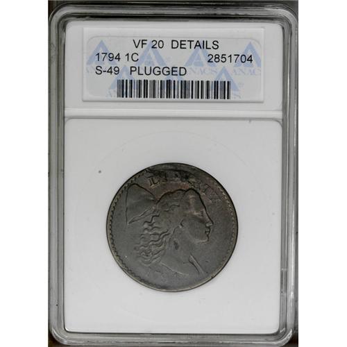 <B>1794<1C> Head of 1794--Plugged--ANACS. VF20 Details.</B></I> S-49, B-41, R.2. The fraction bar and denominator have been tooled away, and similar heavy, crude tooling affects the IBE in LIBERTY. This glossy example has a pit on the neck, and is generally sharp aside from uneven wear on the upper right reverse legend. EAC 4.