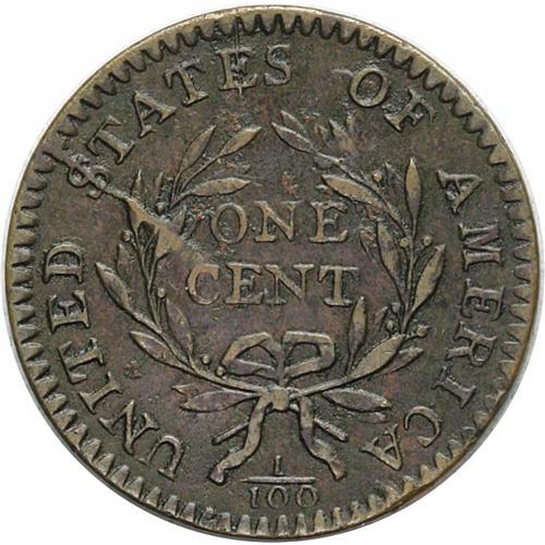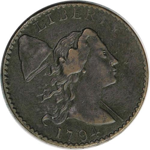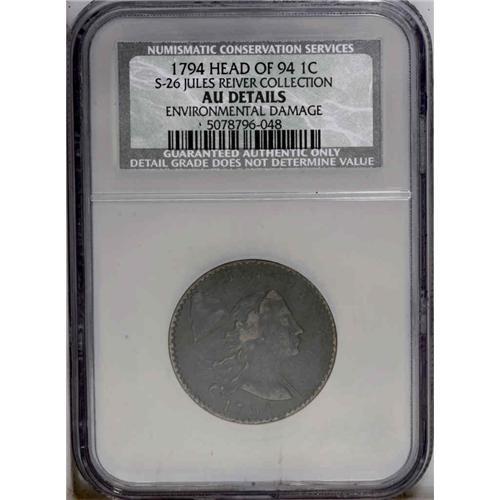 <B>1794<1C> Head of 1794. S-26, B-16, R.2--Environmental Damage--NCS. AU Details. Fine 15 EAC.</B></I> A late die state, Breen's State VII, with die cracks through the first S and E in STATES, that through S continuing through the wreath to CE. This example has diminished in grade over the years, being called VF35 in the Schwartz catalog, VF25 (sharpness) in the Naftzger catalog, and now Fine 15. Dark surfaces with "minor rough patina" as described by New Netherlands. Deep olive-brown with steel color and lighter tan on the high points of the design.<BR><I>Ex: Edward H. Schwartz (Abe Kosoff, 10/1961), lot 30; R.E. Naftzger, Jr. (New Netherlands Coin Co., 11/1973), lot 349.</B></I> Envelope Included.