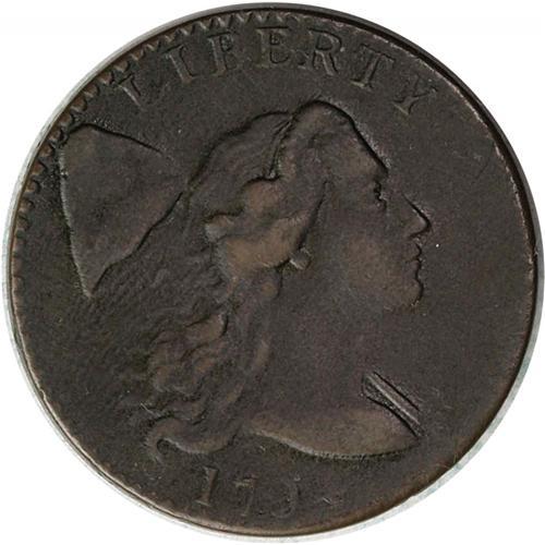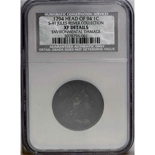 <B>1794<1C> Head of 1794. S-41, B-30, R.3--Environmental Damage--NCS. XF Details. Fine 12 EAC.</B></I> Dark steel-brown surfaces with traces of tan on the high points of the devices. Lightly corroded and burnished surfaces. An attractive example, however. A middle die state with cracks through D and between AT.<BR><I>Ex: George Ramont (3/4/1966).</B></I> Envelope Included.