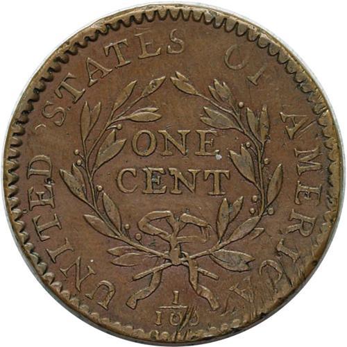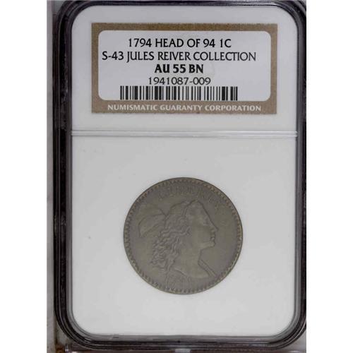 <B>1794<1C> Head of 1794. S-43, B-32, High R.2. AU55 NGC. VF35 EAC.</B></I> The right side of the reverse has peripheral scratches, appearing almost like adjustment marks except that the copper coins were already well-adjusted. Lovely chestnut brown surfaces with lighter olive color on the devices. Although it is a common variety, most known examples of S-43 are in lower grades. The Reiver Collection specimen is probably in the top two dozen for the variety, despite its challenges. An early die state with only minor cracks on each side.<BR><I>Ex: Willard C. Blaisdell (2/8/1971).</B></I> Envelope Included.