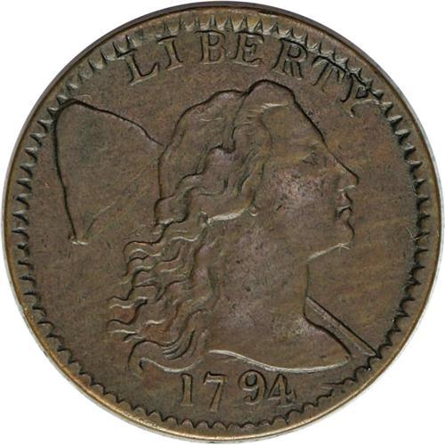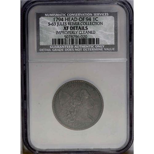 <B>1794<1C> Head of 1794. S-63, B-37, Low R.3--Improperly Cleaned--NCS. XF Details. Fine 15 EAC.</B></I> The so-called Fallen 4 variety, as the digit 4 appears to be out of position. Careful study reveals that it is actually the digit 9 that is out of position, a little high and leaning slightly left. Pleasing olive and tan surfaces with streaks of maroon color. The surfaces are lightly marked, mostly on the reverse. An early die state without any visible clash marks.<BR><I>Ex: Martin (11/9/1968).</B></I> Envelope Included.