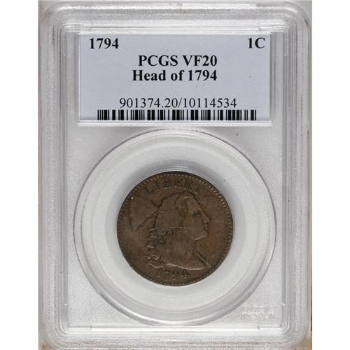 <B>1794<1C> Head of 1794 VF20 PCGS.</B></I> S-46, B-36, R.3. Moderate, even wear is spread over the surfaces of this medium brown piece, a representative of a scarce issue. Minor abrasions appear on each side. EAC 8.