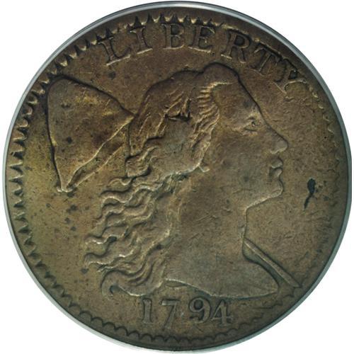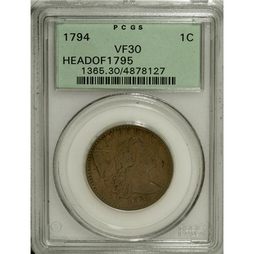 <B>1794 1C Head of 1794 VF30 PCGS.</B></I> S-63, B-37, R.2. The distinctive "Fallen 4" variety. This golden-brown example has bold features and moderate obverse marks. A small planchet flaw is noted on the field near the chin. Housed in a green label holder that incorrectly identifies the cent as a "Head of 1795." EAC 12.<BR><BR><b>Shipping:</b> Coins & Currency (<a target="_blank" href="http://www.heritageauctions.com/common/shipping.php">view shipping information</a>)