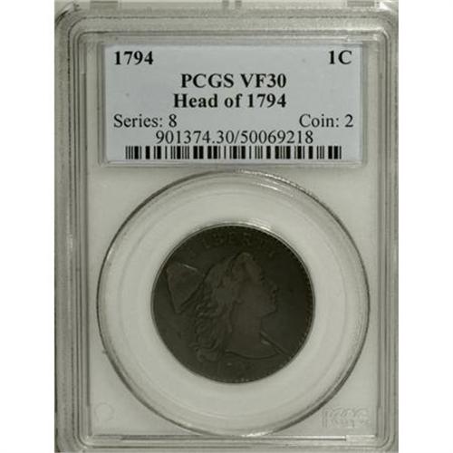 <B>1794 1C Head of 1794 VF30 PCGS.</B></I> S-31, B-13, R.1. One of Maris' Marred Field varieties, named for the die lumps on the lower left obverse field. This lavender-brown 1794 cent is surprisingly void of marks and has attractive eye appeal. Slightly glossy on the lower right reverse, and the field above the date and the TE in UNITED has an irregular texture. EAC 12.<BR><I>From The Arnold & Harriet Collection.</B></I><BR><BR><B>Coin Engraver:</B> Joseph Wright<BR><BR><b>Shipping:</b> Coins & Currency (<a target="_blank" href="http://www.heritageauctions.com/common/shipping.php">view shipping information</a>)