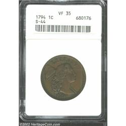1794 1C Head of 1794 VF35 ANACS. S-44, High R.1. An easily attributed variety due to the diagonal die crack (as made) through the date, with another from the N in ONE. Lovely chocolate-brown patina dominates, with some areas of gray patina that outline the devices and letters. The numerator is faint but visible. A wispy horizontal pinscratch below the eye is the only distraction. Important notice: We expect to be auctioning lots at the rate of 200-250 per hour. Sometimes eBay Premier live bid software cannot keep up with that pace, so we strongly recommend that you place a realistic proxy bid now as insurance to avoid disappointment. Also please note that all Heritage/CAA lots purchased through eBay Premier carry a 20% Buyer's Premium. Please make sure you read the Terms and Conditions.