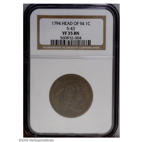 <B>1794<1C> Head of 1794 VF35 NGC.</B></I> S-43, High R.2. Faint luster remnants are uniformly evident across both sides. A patch of light porosity resides on the left reverse, beneath the ITE of UNITED. There are a pair of small abrasions on Liberty's neck, and a short die crack (as struck) crosses through 17 in the date. The dies are rotated clockwise by approximately thirty-five degrees. A well detailed tan-brown example, for the grade.