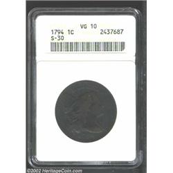 1794 1C Head of 1794 VG10 ANACS. S-30, R.1. The base of Liberty's cap has a dig, with a smaller abrasion near the left field die scratch (as struck) that lends this variety its 'Marred field' nickname. A dark and faintly granular example that is somewhat weakly struck on the upper left portion of the wreath. All legends are clear, and the portrait is sharp for the grade. Important notice: We expect to be auctioning lots at the rate of 200-250 per hour. Sometimes eBay Premier live bid software cannot keep up with that pace, so we strongly recommend that you place a realistic proxy bid now as insurance to avoid disappointment. Also please note that all Heritage/CAA lots purchased through eBay Premier carry a 20% Buyer's Premium. Please make sure you read the Terms and Conditions.