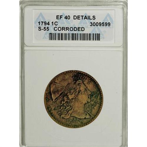 <B>1794 1C Head of 1794--Corroded--ANACS. XF40 Details.</B></I> S-55, B-47, R.2. Medium brown with blushes of lilac. The obverse field is irregularly pitted, although the reverse is relatively smooth aside from several small pits at 5:30. Splendidly detailed and collectible. EAC 12.<BR><BR><B>Coin Engraver:</B> Joseph Wright<BR><BR><b>Shipping:</b> Coins & Currency (<a target="_blank" href="http://www.heritageauctions.com/common/shipping.php">view shipping information</a>)