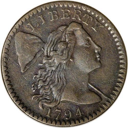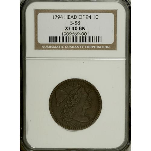 <B>1794 1C Head of 1794 XF40 NGC.</B></I> S-58, B-56, R.3. The legends are bold, and Liberty's hair is splendidly delineated. This medium-brown and steel-blue representative has few marks, although minor granularity is noted near the base of Liberty's neck. 1794 cents are collectible, but are often porous or well circulated. Sharp, attractive pieces are under strong collector demand. EAC 20.<BR><BR><b>Shipping:</b> Coins & Currency (<a target="_blank" href="http://www.heritageauctions.com/common/shipping.php">view shipping information</a>)