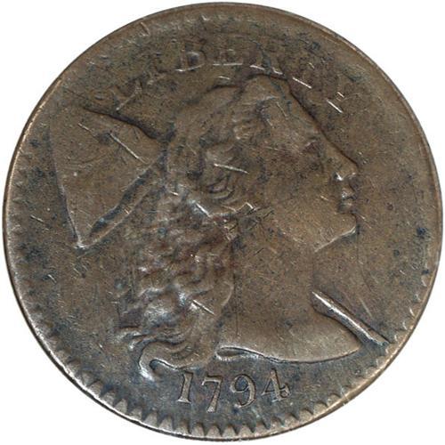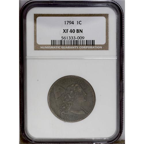 <B>1794<1C> Head of 1794 XF40 NGC.</B></I> S-57, R.1. Maris' "Pyramidal Head." The surfaces are medium brown with darker accents around and within the recesses of the devices. Irregularly struck with weak definition on the upper obverse. Both sides are peppered with numerous small abrasions, and there is a scratch on the lower reverse. EAC 15. <BR><BR><B>Important notice:</B> Heritage usually auctions material at the rate of 200-250 lots per hour. On some occasions eBay Live bid software or the Internet may not be able to keep up with the pace of the auction. We recommend placing a realistic absentee bid now as insurance to avoid disappointment. Occasionally the auctioneer may eliminate or reject an eBay Live bid, and the auctioneer may also reopen a lot after the close of the eBay live bidding (usually because we missed an audience bid), and may reject your bid even if it shows you as the winning bidder. By bidding via eBay Live, you agree that Heritage may award the lot to another bidder at its sole discretion under the circumstances described above or any other reasonable circumstances. Since eBay bids are not shown to us until we open the lot on the floor, we treat those bids just like floor bids. In most cases the floor responds before the eBay bid is presented to us, due to Internet lag time, so for consistency we have made it a policy that floor bids are always considered first over tie eBay live bids. Also please note that all Heritage lots purchased through eBay Live carry a 20% Buyer's Premium. Please make sure you read the Terms and Conditions before you bid. This lot is being auctioned in conjunction with a live floor auction by Heritage Galleries & Auctioneers. All final auction and invoice information will be supplied by Heritage Galleries & Auctioneers, and all other information should be considered preliminary. Lot:239 <BR><BR><B>Winning Notification and Billing:</B> After the FINAL session in this auction is complete, Heritage will send e-mail and snail mail invoices. This process normally takes several days. All final auction and invoice information will be supplied by Heritage Galleries & Auctioneers, and all other information should be considered preliminary. <BR><BR>This auction will be conducted on a live auction floor and over the Internet through eBay Live. If you choose to place an absentee bid, please take a moment to <font color='#0000ff'><u><a href='http://pages.ebay.com/liveauctions/help/before/laabsentee.html'>learn how eBay Live absentee bidding works</a></u></font><font color='#000000'>