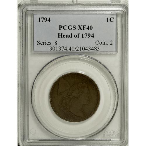 <B>1794 1C Head of 1794 XF40 PCGS.</B></I> S-63, B-37, High R.4. The "Fallen 4" variety, among the more conspicuous Sheldon marriages for the date. The engraver placed too wide a space between the 7 and 9, and the 4 had to be entered low to prevent its overlapping the bust. This golden-brown representative is surprisingly spot-free and unabraded aside from a couple of moderate edge nicks at 3:30 and 8 o'clock. EAC 20.<BR><BR><b>Shipping:</b> Coins & Currency (<a target="_blank" href="http://www.heritageauctions.com/common/shipping.php">view shipping information</a>)