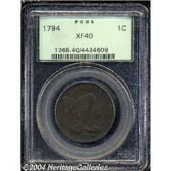 <B>1794<1C> Head of 1794 XF40 PCGS.</B></I> S-31, R.1. The long, heavy fraction bar identifies the variety. An attractive walnut-brown Cent that has strong details on the devices and is nearly free from verdigris or granularity. A faint handling mark on Liberty's cheek and another parallel but distant from the pole are inconspicuous and are only visible when viewed under a loupe and a light. 1794 Cents are widely collected by Sheldon variety, and this sharp example would upgrade the majority of advanced early copper cabinets. <BR><BR><B>Important notice:</B> Heritage usually auctions material at the rate of 200-250 lots per hour. On some occasions eBay Live bid software or the Internet may not be able to keep up with the pace of the auction. We recommend placing a realistic absentee bid now as insurance to avoid disappointment. Occasionally the auctioneer may eliminate or reject an eBay Live bid, and the auctioneer may also reopen a lot after the close of the eBay live bidding (usually because we missed an audience bid), and may reject your bid even if it shows you as the winning bidder. By bidding via eBay Live, you agree that Heritage may award the lot to another bidder at its sole discretion under the circumstances described above or any other reasonable circumstances. Since eBay bids are not shown to us until we open the lot on the floor, we treat those bids just like floor bids. In most cases the floor responds before the eBay bid is presented to us, due to Internet lag time, so for consistency we have made it a policy that floor bids are always considered first over tie eBay live bids. Also please note that all Heritage lots purchased through eBay Live carry a 20% Buyer's Premium. Please make sure you read the Terms and Conditions before you bid.