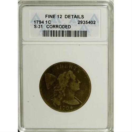 <B>1794 1C Head of 1795--Corroded--ANACS. Fine 12 Details.</B></I> S-31. NGC Census: (17/265). PCGS Population (24/353). Mintage: 918,521. Numismedia Wsl. Price for NGC/PCGS coin in F12: $650. (#1365)<BR><BR><b>Shipping:</b> Coins & Currency (<a target="_blank" href="http://www.heritageauctions.com/common/shipping.php">view shipping information</a>)