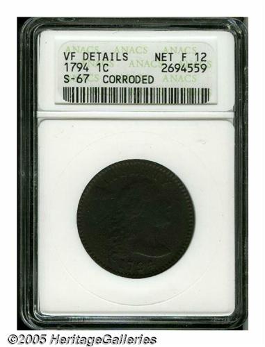 <B>1794<1C> Head of 1795--Corroded--ANACS. VF Details, Net Fine 12,</B></I> S-67, R.3. A boldly detailed but granular example. All legends are clear, and there are no visible marks.