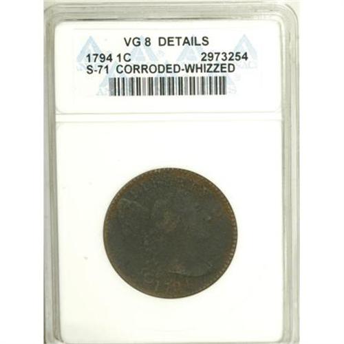 <B>1794 1C Head of 1795--Corroded, Whizzed--ANACS. VG8 Details.</B></I> S-71. NGC Census: (7/287). PCGS Population (15/391). Mintage: 918,521. Numismedia Wsl. Price for NGC/PCGS coin in VG8 : $392. (#1365)<BR><BR><b>Shipping:</b> Coins & Currency (<a target="_blank" href="http://www.heritageauctions.com/common/shipping.php">view shipping information</a>)