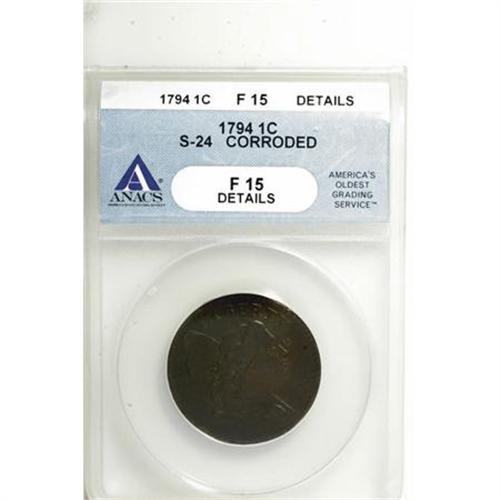 <B>1794 1C Head of 1795--Corroded--ANACS. Fine 15 Details.</B></I> S-24. NGC Census: (13/258). PCGS Population (31/320). Mintage: 918,521. Numismedia Wsl. Price for NGC/PCGS coin in F15: $1,018. (#1365)<BR><BR><B>Coin Engraver:</B> Joseph Wright<BR><BR><b>Shipping:</b> Coins & Currency (<a target="_blank" href="http://www.heritageauctions.com/common/shipping.php">view shipping information</a>)