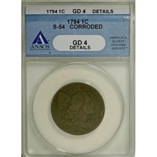 <B>1794 1C Head of 1795--Corroded--ANACS. Good 4 Details. Snow</B></I>-54.<B> </B></I>NGC Census: (5/307). PCGS Population (5/415). Mintage: 918,521. Numismedia Wsl. Price for NGC/PCGS coin G 4 G4 : $350. (#1365)<BR><BR><B>Coin Engraver:</B> Joseph Wright<BR><BR><b>Shipping:</b> Coins & Currency (<a target="_blank" href="http://www.heritageauctions.com/common/shipping.php">view shipping information</a>)