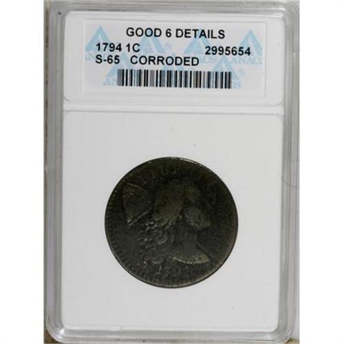 <B>1794 1C Head of 1795--Corroded--ANACS. Good 6 Details.</B></I> S-65. NGC Census: (6/295). PCGS Population (9/404). Mintage: 918,521. Numismedia Wsl. Price for NGC/PCGS coin in G6 : $281. (#1365)<BR><BR><B>Coin Engraver:</B> Joseph Wright<BR><BR><b>Shipping:</b> Coins & Currency (<a target="_blank" href="http://www.heritageauctions.com/common/shipping.php">view shipping information</a>\)