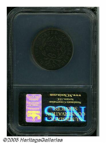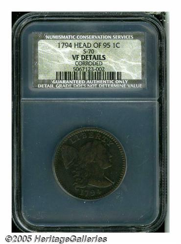 <B>1794<1C> Head of 1795 VF Details, Corroded, NCS.</B></I> S-70, Low R.2. This deep brown Head of '95 Cent has pleasing sharpness, although the surfaces are moderately granular throughout. A couple of small and unimportant marks are on the upper reverse, and the reverse rim has a nick at 3 o'clock.