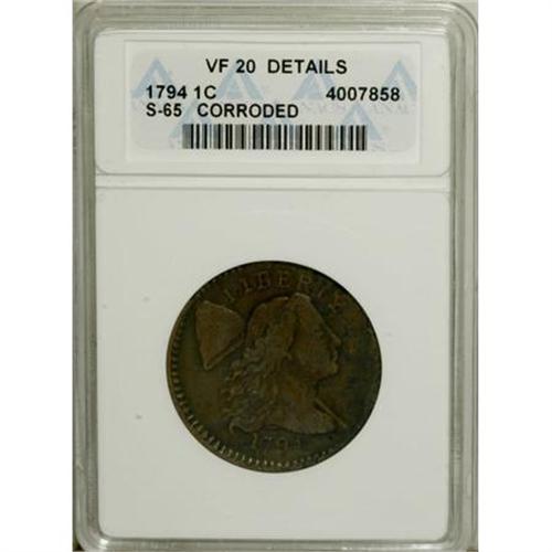 <B>1794 1C Head of 1795--Corroded--ANACS. VF20 Details.</B></I> NGC Census: (15/242). PCGS Population (43/276). Mintage: 918,521. Numismedia Wsl. Price for NGC/PCGS coin in VF20: $1,700. (#1365)<BR><BR><B>Coin Engraver:</B> Joseph Wright<BR><BR><b>Shipping:</b> Coins & Currency (<a target="_blank" href="http://www.heritageauctions.com/common/shipping.php">view shipping information</a>)