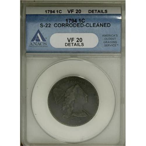 <B>1794 1C --Cleaned, Corroded--ANACS. VF20 Details.</B></I> S-22. NGC Census: (15/243). PCGS Population (44/276). Mintage: 918,521. Numismedia Wsl. Price for NGC/PCGS coin in VF20: $1,700. (#1365)<BR><BR><B>Coin Engraver:</B> Joseph Wright<BR><BR><b>Shipping:</b> Coins & Currency (<a target="_blank" href="http://www.heritageauctions.com/common/shipping.php">view shipping information</a>)