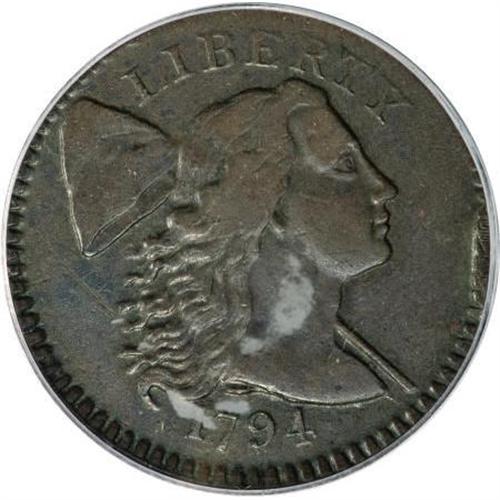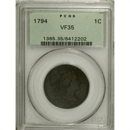 <B>1794 1C Head of 1794 VF35 PCGS.</B></I> S-65, R.1. The date is bold, as are the trailing hair curls, characteristic of this "Shielded Hair" variety, the 1 in the date touches the hair, there are seven berries left and six right, and there is a heavy vertical die crack at 12 o'clock on the reverse. Pleasing chocolate-brown surfaces display well defined design features. The obverse has a rim bruise at 3 o'clock. A sharp VF35, housed in a green label holder. EAC 12.<BR><I>From The Chandler Collection.</B></I><BR><BR><B>Coin Engraver:</B> Joseph Wright<BR><BR><b>Shipping:</b> Coins & Currency (<a target="_blank" href="http://www.heritageauctions.com/common/shipping.php">view shipping information</a>)