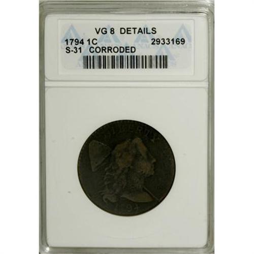 <B>1794 1C Head of 1795--Corroded--ANACS. VG8 Details.</B></I> S-31. NGC Census: (12/464). PCGS Population (15/0). Mintage: 918,521. Numismedia Wsl. Price for NGC/PCGS coin in VG8 : $392. (#1365)<BR><BR><B>Coin Engraver:</B> Joseph Wright<BR><BR><b>Shipping:</b> Coins & Currency (<a target="_blank" href="http://www.heritageauctions.com/common/shipping.php">view shipping information</a>\)