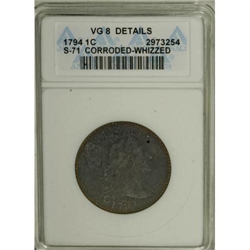 <B>1794 1C Head of 1795--Corroded, Whizzed--ANACS. VG8 Details.</B></I> S-71. NGC Census: (7/293). PCGS Population (15/392). Mintage: 918,521. Numismedia Wsl. Price for NGC/PCGS coin in VG8 : $425. (#1365)<BR><BR><B>Coin Engraver:</B> Joseph Wright<BR><BR><b>Shipping:</b> Coins & Currency (<a target="_blank" href="http://www.heritageauctions.com/common/shipping.php">view shipping information</a>)