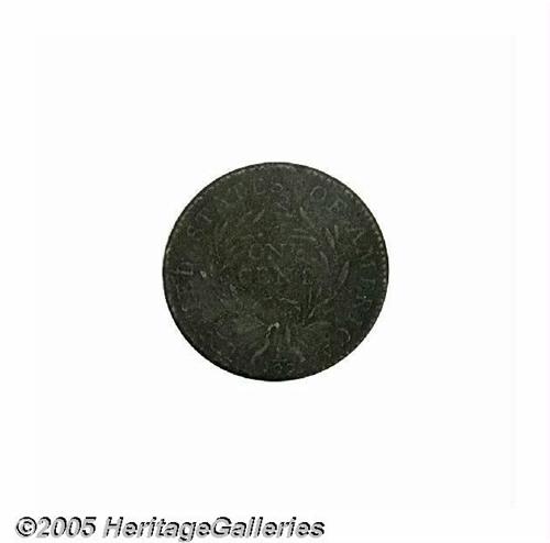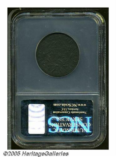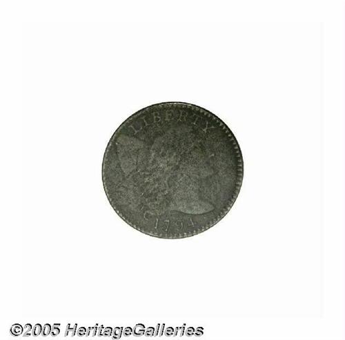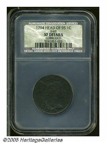 <B>1794<1C> Head of 1795 XF Details, Corroded, NCS.</B></I> S-67, R.3. A dark and granular lavender-brown representative. Although corroded, all legends are easily read with the unaided eye. Most 1794 Cents are from the Head of 1794 subtype, credited to Robert Scot. The scarce Head of 1795 is believed to be from punches created by assistant engraver John Smith Gardner.
