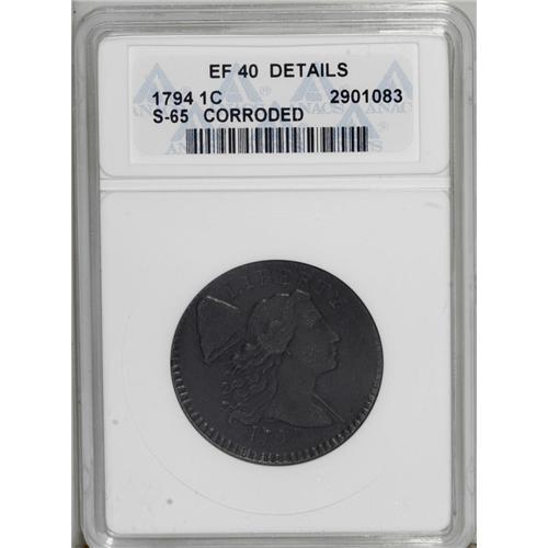 <B>1794<1C> Head of 1794--Corroded--ANACS. XF40 Details.</B></I> S-65, B-51, R.1. Significant corrosion is visible over most of each side, though the chocolate-brown surfaces are generally abrasion-free. The obverse details are still strong. EAC 12.
