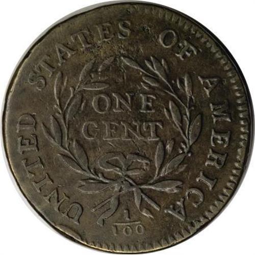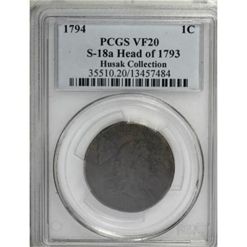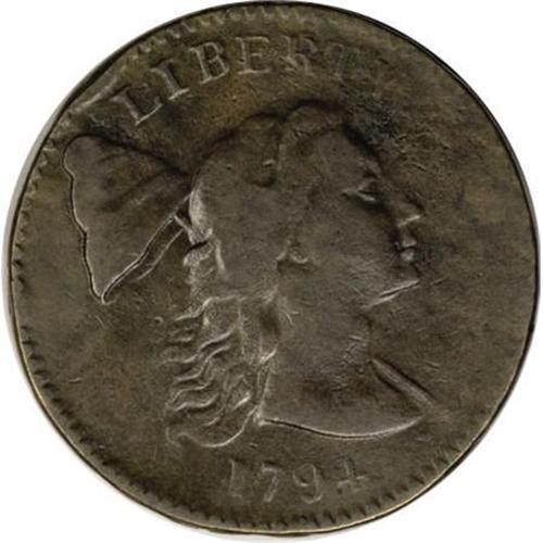 <B>1794 1C Head of '93. VF20 PCGS. S-18a, B-2a, R.6. </B></I> <B>Bland Fine 12; tied for CC-3. Noyes Fine 12; CC-3. Photo #32992. Our EAC Grade Fine 12.</B></I><BR><BR><B>Equivalents. </B></I>Maris 52; Frossard 2.2; Doughty 20, 65; Hays 3; McGirk 7-A; Ross 2-B; Chapman 3; EAC 2a; <I>Encyclopedia </B></I>1650; PCGS #1362.<BR><BR><B>Variety. </B></I>Head of '93; the chin is doubled. Blundered N in CENT, first cut inverted. The obverse appears on S-18a, S-18b, S-19a, and S-19b. The reverse appears on S-17a, S-18a, S-18b, and NC-4. Lettered Edge, leaf points down.<BR><BR><B>Surfaces. </B></I>Numerous insignificant abrasions appear on each side of slightly rough, mottled olive and dark brown surfaces. The sharpness is slightly finer than the net grade. In 1973 the New Netherlands cataloger described this piece as: "Brown color with streaks of olive. There are a few pit marks and rim bruises on each side and some very small areas of granularity which really aren't disturbing to the naked eye."<BR><BR><B>Die State II.</B></I> The reverse die is lapped with several fragmented leaves at the lower right. A very short obverse die crack between the dentils extends slightly past the dentil tips at 8 o'clock. Later die states are recorded in Breen's <I>Large Cent Encyclopedia</B></I> for S-18b, and may not exist on S-18a.<BR><BR><B>Appearances. </B></I>The reverse is illustrated in Morley on page 41. The obverse and reverse are illustrated in Noyes (2006). The late Tom Morley compiled <I>1794 Large Cents Graded and Updated</B></I> in 1979. Morley depicted each of the known types in various grades, attempting a pictorial grading guide for 1794 cents. In <I>Provenance Gallery of the Year 1794</B></I>, Al Boka wrote: "The grading of 1794s is much too complex to be described through black and white photographs. Large cent grading is a highly developed artform acquired through much practice and experience."<BR><BR><B>Census. </B></I>Third finest of a very rare subvariety and a great prize for the 1794 specialist. The finest known S-18a is the ANS VF30, with a rather severe planchet defect. The VF20 discovery coin for the subvariety, now in the Daniel Holmes Collection, is second finest, followed by this coin and one other that are tied for third best. Of the 19 known examples of this variety, only eight grade Good or better. S-18a crossed over to the R.6 level in the early 1980s.<BR><BR><B>Commentary. </B></I>Sheldon called this rare Head of '93 variety the "Double Chin," a nearly exact replica of 1793 Obverse 12, now with a pronounced double chin. Nineteen examples of this subvariety are known, a substantial increase over the six or seven coins known to Sheldon in 1958.<BR><BR>Older collectors labeled the 1793 Liberty Cap cents and the 1794 Head of '93 cents the French Heads. This label was not a description of the design. Rather, it was a response to the incorrect belief that the dies were engraved in France and imported by the Mint. In <I>Early American Cents</B></I>, Sheldon quotes from a lecture given by Foster Lardner many years before the 1949 publication of that reference, noting that the 1793 Liberty Cap cents and the first four varieties of 1794 "were struck from dies made abroad, presumably by Drost, and perhaps as retribution for the wretched quality of the first dies he sent us." As recently as 1979 the European myth remained with some collectors. Tom Morley wrote that the S-17 and S-18 cents were struck from dies "probably coming from abroad."<BR><BR><B>Provenance. </B></I><I>Henry C. Colvin (French's, Sale #80, 10/1962), lot 21, $400; R.E. Naftzger, Jr. (New Netherlands, 11/1973), lot 339, $1,200; Del Bland (3/1976); Dr. Robert A. Schuman; Myles Z. Gerson; Del Bland (3/1984); Darwin Palmer; George E. Ewing, Jr. (11/1993); Wes Rasmussen (Heritage, 1/2005), lot 3022, $16,100.</B></I><BR><BR><B>Personality. </B></I>The large cent collection of <B>Henry C. Colvin</B></I> was the most significant group of early copper handled by Charles French of Troy, New York. The sale was held in conjunction with the October 1962 Middle Atlantic Numismatic Association (MANA) Convention, French's 80th sale. Among lots in the collection were 42 different 1794 cents.<BR><BR><b>Shipping:</b> Coins & Currency (<a target="_blank" href="http://www.heritageauctions.com/common/shipping.php">view shipping information</a>)