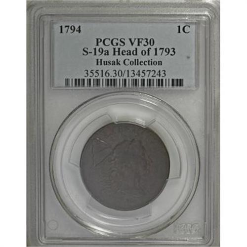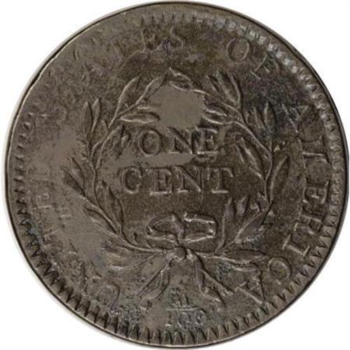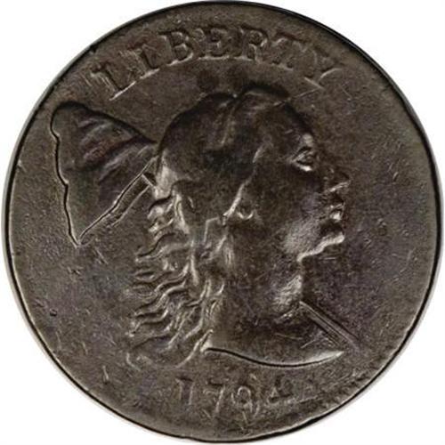 <B>1794 1C Head of '93. VF30 PCGS. S-19a, B-3a, High R.5. </B></I> <B>Bland VF20; tied for CC-3. Noyes Fine 12; CC-5. Photo #20253. Our EAC Grade Fine 15.<BR><BR>Equivalents. </B></I>Maris 2 (Double Chin); Frossard 2.1; Doughty 19; Hays 2; McGirk 8-B; Ross 2-A; Chapman 2; EAC 3a; <I>Encyclopedia </B></I>1652; PCGS #1362.<BR><B><BR>Variety. </B></I>Head of '93; the chin is doubled. Dentils, stems, and ribbons are unusually long. The obverse appears on S-18a, S-18b, S-19a, and S-19b. The reverse appears on S-19a, S-19b, S-20, S-21, and NC-7. Lettered Edge, leaf points down. The edge is blundered: ONE HUNDREDED FOR A DOLLAR as pointed out by McCawley and Grellman in the Ruttenberg catalog.<BR><B><BR>Surfaces. </B></I>The surfaces are glossy and dark brown, as expected from the crude, darker planchets used on this variety. Lightly abraded with traces of corrosion on the lower reverse; dark maroon patina can be seen on each side. The obverse has a minuscule rim bruise at 2 o'clock. Portions of the reverse are covered with an unidentified, possibly removable substance. As so often on the early cents, the description of imperfections makes the coin sound worse than it actually is.<BR><BR><B>Die State I. </B></I>The obverse has a light bulge from the lower edge of the cap to the middle hair curls.<BR><BR><B>Appearances. </B></I>The obverse and reverse are illustrated in Noyes (2006).<BR><BR><B>Census. </B></I>Although this example has the second best sharpness of any known example, it ranks lower in the Census due to minor grade deductions. Del Bland records it as third finest in his Census, while Bill Noyes ranks the coin as fifth finest. The finest example is a VF30 coin in the Daniel Holmes Collection, graded AU50 by Sheldon and identified by him in 1949 as the only high grade, light-colored example he had seen. It is also identified by Bland as the discovery coin for the variety, with a pedigree dating back to Harlan P. Smith, circa 1900.<BR><BR>Sheldon described the present coin from the Dupont Collection as second finest known in <I>Penny Whimsy</B></I>. Two others, including one in the ANS, grade VF20. Just over 30 examples are known today, at least half discovered in the past 25 years. Most of the recently discovered examples are in lower grades. Five of the top six have been known for more than 50 years.<BR><BR><B>Commentary. </B></I>Breen suggested that all of the Head of '93 cents were coined January 10 - 13, 1794, with a delivery of 11,000 pieces on the latter date. Some of these were probably struck from the new copper that arrived in November 1793 from Taylor and Bailey of London.<BR><BR>Maris identified S-19 as the "ugly tooth" reverse, since the denticles are long and heavy with sharp points. Perhaps not the most endearing of descriptions, but the desirability of this variety is derived from its rarity and not superior die engraving.<BR><BR><B>Provenance. </B></I><I>Carl Wurtzbach; Charles J. Dupont (Stack's, 9/1954), lot 27, $250; Dorothy Paschal (5/1975); Denis W. Loring (5/1983); Del Bland; Jack H. Robinson; Douglas F. Bird; Gary Ruttenberg (McCawley & Grellman Auctions, 8/1996), lot 72, $12,100; Wes Rasmussen (Heritage, 1/2005), lot 3024, $12,650.</B></I><BR><BR><B>Personality. </B></I>After the death of Joseph Wright, <B>Robert Scot</B></I> (sometimes spelled Scott) was appointed as Mint engraver on November 23, 1793. Scot was born in Scotland on October 2, 1745, and moved to Philadelphia in 1782. He was appointed as engraver for Virginia circa 1780. Scot was noted to be undersize, and an honorable and agreeable man. George Evans wrote that "at the time of his appointment he seems to have been turning the down-hill of life" even though he was just 48 years old. Scot continued in the position until his death in November 1823. In the later years of his tenure, most of the engraving work was performed by John Reich until Reich resigned in 1817.<BR><BR><b>Shipping:</b> Coins & Currency (<a target="_blank" href="http://www.heritageauctions.com/common/shipping.php">view shipping information</a>)