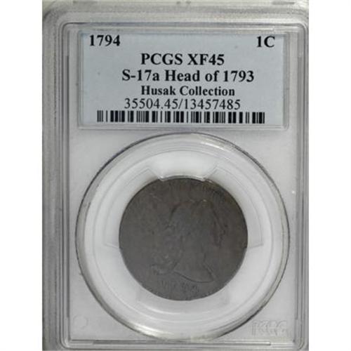 <B>1794 1C Head of '93. XF45 PCGS. S-17a, B-1a, Low R.5.</B></I> <B>Bland VF30; tied for CC-3. Noyes VF30; tied for CC-3. Photo #20003. Our EAC Grade VF30.<BR><BR>Equivalents.</B></I> Maris 4 (Tilted 4); Frossard 3; Doughty 22; Hays 4; McGirk 7-B; Ross 3-B; Chapman 4; EAC 1a; <I>Encyclopedia </B></I>1648; PCGS #1362.<BR><B><BR>Variety.</B></I> Head of '93; date is wide and straight. Blundered N in CENT, first cut inverted. The obverse appears on S-17a and NC-4. The reverse appears on S-17a, S-18a, S-18b, and NC-4. Lettered Edge, leaf points down.<BR><BR>Each of the Head of 1793 varieties (S-17 through S-20) is known with "a" and "b" subvarieties representing different edge types. The 1793 edge, designated in each case as the "a" subvariety, has the tip and stem of the leaf pointing down in relation to the letters. The 1794 edge, designated as the "b" subvariety, has the tip and stem of the leaf pointing up.<BR><BR>Two examples of S-17 are known with the 1794 edge device, designated as NC-4. One of those has a pedigree dating back to the 1930s, but the 1794 edge device was not properly identified until 1950, when C. Douglas Smith owned the coin.<BR><BR><B>Surfaces. </B></I>The sharpness is possibly five points finer. Smooth medium tan and olive surfaces, with streaks of darker steel on both sides. A small area at the center of the obverse has a slightly higher gloss than the surrounding surface. A minor rim bruise is visible beneath the digit 4 on the obverse and over ES on the reverse. Otherwise, only the usual minute grade-associated handling marks are visible on each side.<BR><BR><B>Die State II.</B></I> Reported as State II in Breen's <I>Large Cent Encyclopedia,</B></I> this piece appears to be intermediate between States II and III. The obverse is cracked from the rim to pole, and weakly from the top of Liberty's head to the left base of L and a denticle left of that letter. Both sides have prominent clash marks.<BR><BR><B>Appearances. </B></I>The obverse and reverse are illustrated in Noyes (2006).<B> </B></I>Del Bland states that the obverse of this piece is illustrated in Morley. Granted, the VF30 coin plated in Morley has a similar rim bump over B in LIBERTY, but that coin actually appears to be the Ruby-Halpern-Neiswinter specimen.<BR><BR><B>Census. </B></I>Finest known for the variety is an AU50 in the ANS Collection, followed by a single XF40. Three VF30 coins, including this example, are next in the Census. These five census level coins are followed by several pieces that grade below Very Fine. Only two of the top six examples in the Census were known when <I>Early American Cents</B></I> was published. The Newcomb-Adams specimen, graded Fine 12 by Bland, is the discovery coin for the variety with a pedigree back to Dr. Maris.<BR><BR><B>Commentary. </B></I>In 1949 Sheldon was aware of the ANS coin, but noted that there were no other coins called better than Fine. This VF30 example was located in England a year later, and was called "far the finest in collectors' hands" by Sheldon in <I>Penny Whimsy</B></I>. Just three other similar quality pieces have been discovered in the last six decades.<BR><BR>Walter Breen wrote in his <I>Large Cent Encyclopedia</B></I> that the first 1794 cents have the same general appearance as the 1793 Liberty Cap cents, on streaky planchets that often show laminations and other defects. He explained that copper supplied by Ferdinand Gourdon on August 1, 1793, was used for all of those coins.<BR><BR><B> </B></I>Robert Scot prepared dies for the 1794 Head of '93 cents from the original Liberty Cap device punch, created by Joseph Wright a few months earlier. The punch became unserviceable after just three obverse dies were prepared. On each of the three dies, the date and LIBERTY were entered by hand.<BR><BR><B>Provenance. </B></I><I>Discovered in England (1950); Henry Grunthal (1951); Dr. William H. Sheldon (1970); Dorothy Paschal (3/1977); R.E. Naftzger, Jr. (2/1992); Eric Streiner (3/1992); Denis W. Loring (8/1993); Dr. Robert A. Schuman (5/1994); Dr. Allen Bennett (2001).</B></I><BR><BR><B>Personality. </B></I>A brief introduction to <B>Henry Grunthal</B></I> appeared in the July 1969 <I>The Numismatist</B></I>: "He has been a member of the ANA since 1929. He studied archaeology at the University of Berlin, and continued this study and that of the history of art at the Sorbonne in Paris and at the University of Jena. While at Jena he held the position of assistant curator at the Coin Cabinet of the Duke of Saxony Coburg-Gotha in Gotha. He later entered his father's numismatic establishment in Berlin where he remained until 1938, when he emigrated to the United States.<BR><BR>"After devoting most of his time in the United States as a professional numismatist, he was appointed in 1953 to the position of assistant to the chief curator at the American Numismatic Society where he now holds the position of curator of European and modern coins. He is the author of many numismatic articles and co-author of the American Numismatic Society's monograph on Carolingian coinage."<BR><BR><b>Shipping:</b> Coins & Currency (<a target="_blank" href="http://www.heritageauctions.com/common/shipping.php">view shipping information</a>)