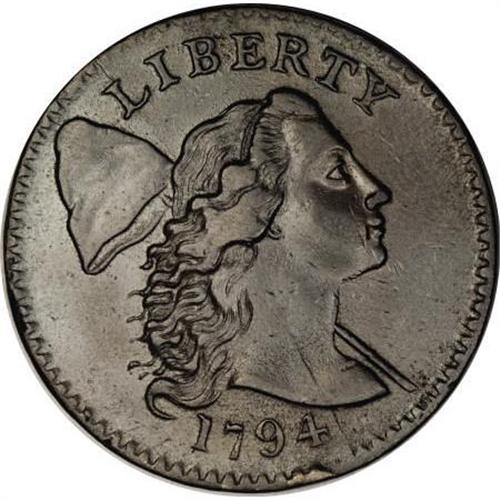 <B>1794 1C Head of '94. AU50 PCGS. S-24, B-8, R.1. </B></I> <B>Noyes VF25; tied for CC-23. Photo #37541. Our EAC Grade VF35.<BR><BR>Equivalents. </B></I>Maris 12 (Scarred Head); Frossard 8; Doughty 32; Hays 17; McGirk 4-B; Ross 11-K; Chapman 8; EAC 8; <I>Encyclopedia </B></I>1657; PCGS #901374.<BR><B><BR>Variety. </B></I>The Apple Cheek; face has a full, rounded cheek. Numerator tall and resting on fraction bar. The obverse appears on S-24. The reverse appears on S-23 and S-24. Lettered Edge, leaf points up.<BR><B><BR>Surfaces. </B></I>Pleasing tan and darker brown on both sides. The obverse has a small rim bump across two dentils below the left side of the 4. The reverse has a shallow depression on the upper right corner of the right ribbon bow and a slight rim bruise over T of UNITED.<BR><B><BR>Die State V.</B></I> The obverse has two die cracks, through L to the head and right of 4 to the bust and neck. In later states, these two cracks join. Considerable die roughness is evident across the lower part of the obverse. The reverse has a minor central bulge, weakening ENT, which eventually becomes heavy, blotting out much of ONE CENT.<BR><B><BR>Census. </B></I>A common variety represented by six Mint State and a similar number of AU pieces. The census seems to drop quickly, with only about a dozen pieces grading VF30 to XF45.<BR><B><BR>Commentary. </B></I>Sheldon's father named S-24 the "Apple Cheek" variety. The cheek and hair details on this obverse are cut more deeply than usual, giving it a distinctive look that is popular with collectors today. The higher relief was also more susceptible to wear, resulting in flat areas of the obverse design, even with a brief time in circulation, as seen on this example.<BR><BR>James Davy offered to procure a supply of copper from England, specifically from Birmingham, available on better terms than copper from London. His Birmingham connection provides additional evidence of his familiarity with Boulton and Watt:<BR><BR> "As a considerable quantity of copper is now to be obtained in this country, it is of importance that rollers be erected on a much larger scale than now in use; such works would not only prepare metal for the Mint, in a better state than it now is, but also supply materials for various manufactories and trades which now are or hereafter may be established, and to the establishment of some of which such supply will greatly contribute, as buttons, buckles, etc., kitchen furniture, various utensils for manufactories, as copper pipes, furnaces, and mills, and also sheathing of bolts, for ship building. As such works however will require a considerable time before they can be accomplished, and an immediate supply will be required for the Mint, from a long residence and connections at Birmingham and an acquaintance with the best markets for copper, I can offer to procure it in a better state, and on better terms than it can be obtained in the London markets."<BR><BR><B>Provenance. </B></I><I>Western Numismatics; Douglas Bird; Gary Ruttenberg (McCawley & Grellman, 8/1996), lot 77, $3,500.</B></I><BR><BR><B>Personality. Albion Cox</B></I> was appointed first assayer of the Mint on April 4, 1794, and served faithfully for a short period until his death on December 1, 1795. He was born in England and came to the United States many years before his appointment. His involvement with the New Jersey coinage left him in debt, and he fled the country in 1787 or 1788 to avoid debtors prison. Cox was an unwilling participant in the "coinage impediment" when he and Henry Voigt were unable to meet the strict requirement of $10,000 bond. Mint Director Elias Boudinot noted that he was an intelligent officer and that the Mint was confined to production of cents until the vacancy was filled, which happened less than two weeks later, when Joseph Richardson was hired.<BR><BR><b>Shipping:</b> Coins & Currency (<a target="_blank" href="http://www.heritageauctions.com/common/shipping.php">view shipping information</a>)