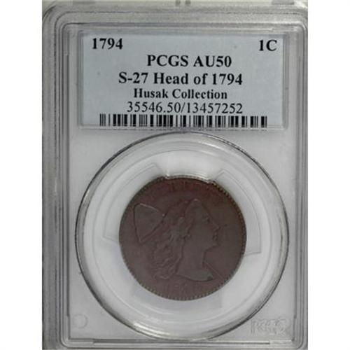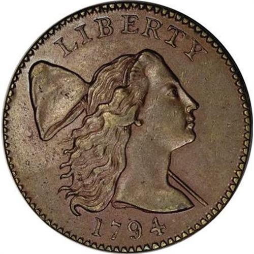 <B>1794 1C Head of '94. AU50 PCGS. S-27, B-9, R.5. </B></I> <B>Bland XF40; CC-2. Noyes VF30; tied for CC-3. Photo #21237. Our EAC Grade VF35.<BR><BR>Equivalents. </B></I>Maris 41 (Egeria); Frossard 28; Doughty 61; Hays 25; McGirk 3-D; Ross 16-P; Chapman 19; EAC 12; <I>Encyclopedia </B></I>1659; PCGS #901374.<BR><B><BR>Variety. </B></I>Buckled obverse die. Single leaf below I in AMERICA covers branch stem. The obverse appears on S-27. The reverse appears on S-27 and S-28. Lettered Edge, leaf points up.<BR><B><BR>Surfaces. </B></I>The sharpness is a few points finer with average surfaces that are marred only by two small reverse rim bruises, one over E of UNITED and another over I of AMERICA. Both sides have pleasing light tan color intermingled with considerable maroon patina. The obverse has a small toning spot on Liberty's bust, a convenient identifier.<BR><BR><B>Die State III.</B></I> A later die state. This piece has a bulge visible in both the left and right obverse fields, with a crack along the bulge in the left field. It is usually identified by the obverse die bulge and is sometimes called the Buckled Die cent.<BR><BR><B>Appearances. </B></I>The obverse is illustrated in Morley as XF40. The obverse and reverse are illustrated in Noyes (2006).<BR><BR><B>Census. </B></I>The finest known S-27 has been returned to the ANS. Bland places this example second in his Census and Noyes considers it third best, with XF45 sharpness.<BR><BR><B>Commentary. </B></I>Sheldon commented in <I>Early American Cents</B></I>: "Maris named this obverse Egeria, after the elusive and secretive wife of legendary King Numa of Rome-perhaps because it was hard to find in good condition." Sheldon wrote in <I>Penny Whimsy</B></I>: "Above VG, the Egeria remains a rare and elusive lady."<BR><BR>Before the planchets could be turned into coins, they had to be annealed and cleaned. Davy reported on improvements that could be made in this area as well. In the following quote, the modern identity of sal enixum is acid potassium sulphate. Oil of vitriol is better known as sulfuric acid, and aqua fortis is now known as nitric acid.<BR><BR>"The metal being cut out it is annealed (that it may receive the impressions designed); by undergoing this process the surface of the copper becomes calcined, from which it must be cleaned, to effect which I find sal enixum is employed, this is neither so powerful or cheap as oil of vitriol, which cleans it full as well; but the most effectual method to perform this is to boil it first until it becomes black in diluted aqua fortis, and afterwards dipping it in some that is stronger. (This observation will also apply to the cleaning the metal when annealed for rolling, only that oil of vitriol will answer for it in this state full as well as aqua fortis.) This will entirely deprive it of all its calx and make it much brighter when finished, and also preserve the polish of the dies better than when it is cleaned by either sal enixum, or oil of vitriol, and on the whole answer better, although it will be rather more expensive."<BR><BR><B>Provenance. </B></I><I>Discovered in England (1970); Lester Merkin (3/1970); R.E. Naftzger, Jr. (New Netherlands, 11/1973), lot 350 $3,200; John W. Adams (1/1975); Denis W. Loring (5/1983); Jack H. Robinson (Superior, 1/1989), lot 44, $16,500; Dr. Allen Bennett (1/1998).</B></I><BR><BR><B>Personality. John Weston Adams</B></I> is a Boston investment banker, a trustee of the Massachusetts Historical Society, and a fellow of the American Antiquarian Society. Born in Boston on April 2, 1936, Adams was educated at Princeton and Harvard, where he earned an MBA in 1960. His numismatic interests are diverse. He formed a world class collection of 1794 large cents that was sold by Bowers and Ruddy in 1982 through a fixed price list. He edited <I>Monographs on Varieties of United States Large Cents, 1793-1794</B></I> and produced a two-volume reference to numismatic auctions conducted in the 19th and 20th centuries. Recently, Adams wrote a comprehensive reference on Indian peace medals of George III.<BR><BR><b>Shipping:</b> Coins & Currency (<a target="_blank" href="http://www.heritageauctions.com/common/shipping.php">view shipping information</a>)