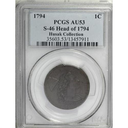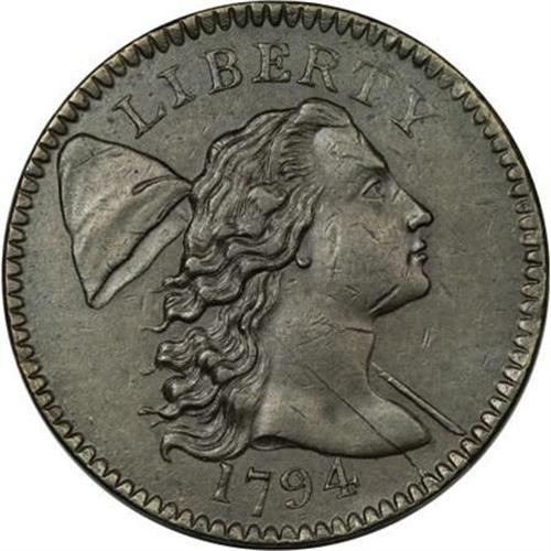 <B>1794 1C Head of '94. AU53 PCGS. S-46, B-36, R.3.</B></I> <B>Bland XF45; tied for CC-6. Noyes XF40; CC-5. Photo #20058. Our EAC Grade XF40.<BR><BR>Equivalents. </B></I>Maris 35 (Plicae); Frossard 20c; Doughty 55; Hays 48; McGirk 3-I1, 3-I2, 3-I3; Ross 29-HH; Chapman 34; EAC 34; <I>Encyclopedia </B></I>1668; PCGS #901374.<BR><B><BR>Variety. </B></I>Hair locks form five heavy braids. Heavy die break or chip crosses E in CENT. The obverse appears on S-45 and S-46. The reverse appears on S-46. Lettered Edge, leaf points up.<BR><B><BR>Surfaces. </B></I>This is a sharply detailed example with pleasing medium brown color that exhibits faint traces of pale blue toning. Both sides have a few trivial surface marks that are inconsequential. A thin depression behind Liberty's chin will aid in provenance tracking. The proper angle of light will also reveal subtle remnants of original mint color.<BR><BR><B>Die State I. </B></I>An early die state. The obverse is cracked from the lower right border through the bust and neck to the hair. Most known examples have extensive cracks on the obverse. The reverse die flaw forming the crossed E in CENT is constant.<BR><BR><B>Appearances. </B></I>The obverse and reverse are illustrated in Chapman and in Noyes (2006). The Breen plate coin is misidentified as this coin.<BR><BR><B>Census. </B></I>This piece falls at the low end of the traditional Condition Census. Bland records two Mint State pieces and three AU examples. Noyes grades this piece XF40 and places it alone in fifth position.<BR><BR><B>Commentary. </B></I>The S-46 is rather plentiful, although it is under no circumstances common. It is another of the "one-glance" varieties, immediately identified by the heavy break or sliver that crosses the E of CENT, nearly reaching the lower right corner of N in ONE.<BR><BR>Many early cent varieties can be identified by unique features. Among the famous one-glance varieties is the Starred Reverse, or S-48, of which the finest known is about to be sold.<BR><BR><B>Provenance. </B></I><I>Arthur Sargent (S.H. Chapman, 6/1913), lot 455, $18; Thomas Elder; Waldo Newcomer; B. Max Mehl; Howard R. Newcomb (J.C. Morgenthau, 2/1945), lot 63, $25; Milton Holmes (Stack's, 10/1960), lot 1375, $360; C. Douglas Smith (1965); Alfred Bonard; Numismatic Enterprises (1968 ANA), lot 1718, $650; Julian Leidman; Dr. Robert Schuman; Denis W. Loring; John W. Adams (Bowers and Ruddy, 1982 FPL), lot 41, $2,750; Denis W. Loring (5/1983); Jack Robinson (Superior, 1/1989), lot 79, $3,740; Gary Ruttenberg (McCawley & Grellman, 8/1996), lot 90, $5,610.</B></I><BR><BR><B>Personality. Waldo Newcomer</B></I> served as president of the National Exchange Bank and as CEO of the Baltimore Trust Company. He was born in 1867. He formed a collection of approximately 4,000 coins that was sold to B. Max Mehl in 1931 for $250,000 after Newcomer lost his fortune in the Depression. His collection is not familiar to modern-day numismatists, as there was no auction catalog, although many of his coins were sold by J.C. Morgenthau in 1939. Circumstances of his death in 1934 are unknown; Walter Breen claimed that he committed suicide.<BR><BR><b>Shipping:</b> Coins & Currency (<a target="_blank" href="http://www.heritageauctions.com/common/shipping.php">view shipping information</a>)