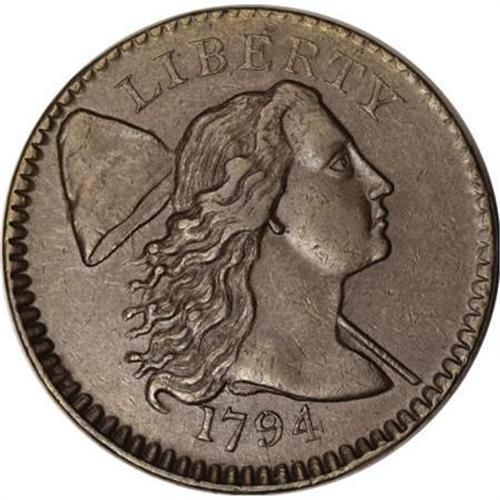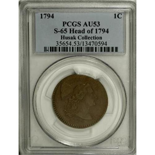 <B>1794 1C Head of '94. AU53 PCGS. S-65, B-51, R.1.</B></I> <B>Bland XF45; tied for CC-6. Noyes XF45; CC-6. Photo #31897. Our EAC Grade XF40.<BR><BR>Equivalents. </B></I>Maris 32 (Shielded Hair); Frossard 19.1; Doughty 52; Hays 45; McGirk 5-C; Ross 28-EE; Chapman 49; EAC 55; <I>Encyclopedia </B></I>1668; PCGS #901374.<BR><B><BR>Variety. </B></I>Shielded Hair, the left border is deep. Right ribbon short, ending above fraction bar. The obverse appears on S-64, S-65, and NC-6. The reverse appears on S-65. Lettered Edge, leaf points up.<BR><B><BR>Surfaces. </B></I>Splendid surfaces with light olive highlights and a background of desirable light brown. Both sides exhibit the usual light handling marks that are consistent with the grade.<BR><B><BR>Die State VI.</B></I> An intermediate die state. The obverse has fine die cracks from the border through the 9, from the border into the field at 4 o'clock, from the border to the bust point, and from the border to the lower corner of the cap. The reverse has cracks from the border through the left side of the final S, forming a small lump just inside the border, and from the border through the final A to the wreath.<BR><BR><B>Appearances. </B></I>The obverse and reverse are illustrated in Noyes (2006).<BR><BR><B>Census. </B></I>Although the most common 1794 variety, only five pieces grade AU or better, including just one in Mint State. The sole Mint State piece did not appear until the mid-1970s. Earlier, Sheldon wrote in <I>Penny Whimsy:</B></I> "Commonest 1794 without a doubt, and we are rather embarrassed to have to report failure in the current search for an MS example."<BR><BR><B>Commentary. </B></I>The dies were out of alignment on both the x-axis and y-axis, so that the left obverse border is always broad and deep, giving the variety its name of the Shielded Hair. Breen noted that the improper alignment was the cause of heavy die cracks, especially on the reverse: the misalignment "put extra stress on the left side of the obverse die so that it is not surprising that the die cracked below the date and left, only that it lasted long enough to create the most common 1794 variety."<BR><BR><B>Provenance. </B></I><I>Purchased at the 1974 Penn-Ohio Convention; Chuck Furjanic; Gordon Wrubel (2/1975); Denis W. Loring (12/1981); Del Bland; George E. Ewing, Jr.; Eric Streiner; Stack's (1/1993), lot 1098, $2,310; Anthony Terranova, Thomas D. Reynolds, and Chris Victor-McCawley.</B></I><BR><BR><B>Personality. </B></I>A coin dealer from Pittsburgh, <B>Chuck Furjanic</B></I> specialized in early copper issues for many years. He currently operates out of Irving, Texas, and also handles golf collectibles. Furjanic is known to large cent collectors for his discovery of the 1794 NC-9 cent.<BR><BR><b>Shipping:</b> Coins & Currency (<a target="_blank" href="http://www.heritageauctions.com/common/shipping.php">view shipping information</a>)