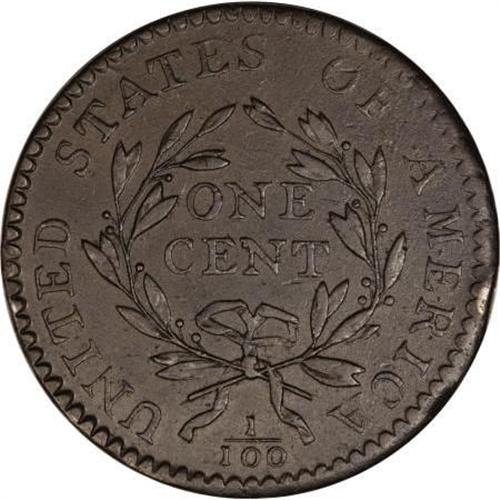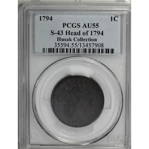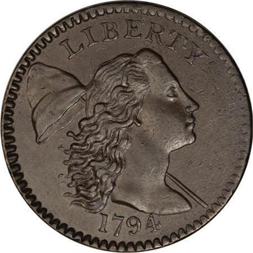 <B>1794 1C Head of '94. AU55 PCGS. S-43, B-32, R.2.</B></I> <B>Bland XF45; tied for CC-7. Noyes VF35; tied for CC-13. Photo #31900. Our EAC Grade XF40.<BR><BR>Equivalents. </B></I>Maris 22; Frossard 13.2; Doughty 43; Hays 34; McGirk 3-G, 3-G2; Ross 23-M; Chapman 35; EAC 30; <I>Encyclopedia </B></I>1668; PCGS #901374.<BR><B><BR>Variety. </B></I>The back of the bust is short; seven hair locks. Short spine from leaf right of base of E in ONE; usually weak at OF. The obverse appears on S-43, S-44, NC-5, and NC-10. The reverse appears on S-42 and S-43. Lettered Edge, leaf points up. This obverse is known as the Short Bust. The back of the bust at the shoulder does not meet the first strand of hair, a diagnostic for identification.<BR><B><BR>Surfaces. </B></I>Dark brown with traces of lighter tan and deeper steel. Slight planchet marks, faint hairlines, and other tiny imperfections are evident. The reverse has a slight rim bruise over ER. The left obverse and reverse borders are slightly deeper than the opposing borders. A fully natural-appearing cent, with surface color testifying to proper storage over many years. Unlike many, this piece has never been cleaned or recolored. Although he was unable to explain why, Breen notes that "many of the best survivors have been recolored."<BR><BR><B>Die State I. </B></I>An early die state from perfect dies without cracks or clash marks, except for the faint reverse crack over A in STATES that Breen describes.<BR><BR><B>Census. </B></I>Only one Mint State example of this otherwise-common variety is known, along with half a dozen that grade AU50. The single Mint State coin was acquired by the ANS from George Clapp and returned to the ANS by R.E. Naftzger, Jr. in 2001. At least two dozen grade VF or better.<BR><BR><B>Commentary. </B></I>Noyes (2005) incorrectly recorded the earlier provenance as lot 229 from the 1976 ANA Sale. Both coins have a small reverse rim bruise, but the 1976 ANA coin has the rim bruise over the right side of M.<BR><BR><B>Provenance. </B></I><I>H. Routz; Andrew Muller; Ronald Cooper; Del Bland; Myles Z. Gerson; Bertram Cohen;</B></I> <I>Tom Morley (Superior, 5/1992), lot 195, $3,520; Chris Victor-McCawley (List #39); Dr. Wallace Lee (5/2003), lot 374, $8,050.</B></I><BR><BR><B>Personality. Tom Morley</B></I> was born in Tawas City, Michigan, on March 9, 1936, and died in Florida on May 16, 2000. Morley was the author of <I>1794 Large Cents Graded and Updated</B></I> in 1979. He cataloged the Nofal-Kling large cents in 1976 and the EAC Sale in 1979. He gained instant notoriety for purchasing several important 1794 cents in the Garrett sale, and leaving them in the back of a New York City taxicab. Fortunately for him and for numismatics, the cents were returned none the worse for wear.<BR><BR><b>Shipping:</b> Coins & Currency (<a target="_blank" href="http://www.heritageauctions.com/common/shipping.php">view shipping information</a>)
