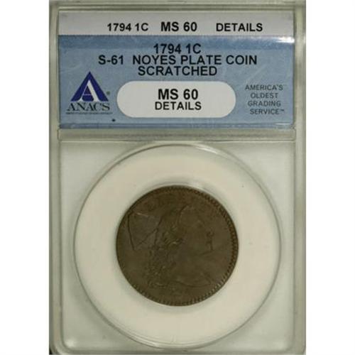 <B>1794 1C Head of '94. MS60 Details, Scratched, ANACS. S-61, B-53, R.4.</B></I> <B>Bland AU55; tied for CC-3. Noyes AU50; CC-4. Photo #21886. Our EAC Grade AU50.</B></I><BR><BR><B>Equivalents. </B></I>Maris 24; Frossard 14.2; Doughty 22; Hays 36; McGirk 6-D; Ross 22-Y; Chapman 42; EAC 50; <I>Encyclopedia </B></I>1668; PCGS #901374.<BR><BR><B>Variety. </B></I>Date is closely spaced, hair is thick and luxuriant. Inside berry left of ONE droops down. The obverse appears on S-60 and S-61. The reverse appears on S-61 and S-62. Lettered Edge, leaf points up.<BR><BR><B>Surfaces. </B></I>The obverse has a light scratch. From the St. Oswald Collection that was sold by Sotheby's in 1964; the scratch is clearly visible in the plate of that catalog. The coin is otherwise exceptional, a solid Mint State piece, with frosty light to medium brown color and full cartwheel luster. A tiny nick is evident in the lower right obverse, just above the pole, and another joins Liberty's eyebrow. Graded AU55 by Del Bland and described by him as "Quality of MS-61 but [with] a long obverse scratch." Rated AU50 by Noyes, who describes the sharpness of MS60 with "Average minus" surfaces. Without the scratch, Noyes would rate this piece at least "Average plus," or perhaps "Choice."<BR><BR><B>Die State IV.</B></I> Later than the last die state described by Breen. The obverse has prominent clash marks between the back of the head and LIB, including the stem, ribbon end, and lowest outer leaf pair from the left branch of the wreath. A faint die crack begins near the left border, the top of the cap, and the tops of LIBE. The reverse has heavy clash marks from dentils through the fraction, both ribbon ends, CA, and UNI. Slight reverse die cracks can be seen from the border to NI, through the tops of TED, STA, and TES.<BR><BR><B>Appearances. </B></I>The obverse and reverse are illustrated in Noyes (1991 and 2006).<BR><BR><B>Census. </B></I>Only six examples of this variety grade better than XF, according to Bland's Census, including just two Mint State coins. Without the scratch, this piece would easily rank second finest known, behind an MS65 that is currently untraced.<BR><BR><B>Commentary. </B></I>This is one of four varieties that were struck on thick planchets, according to Sheldon. The others are S-58, S-59, and S-60. Careful study shows that none of the three are routinely found on thicker or heavier than normal planchets. Breen writes: "Some blanks made in this period are a little heavier than the 208 grains standard. Sheldon claimed that ‘this variety [S-58] and the next three are always struck on extra thick planchets.' The weights given in Chapman do not confirm this conclusion, nor do the weights of American Numismatic Society coins or others checked in recent years. There is, therefore, no justification for designating the coins on heavy blanks as new sub-varieties."<BR><BR><B>Provenance. </B></I><I>St. Oswald Collection (Christie, Manson, & Woods, Ltd., 10/1964), lot 156, $1,008; Stack's; Frank Masters (RARCOA, 5/1971), lot 73, $3,200; R.E. Naftzger, Jr. (2/1992); Eric Streiner; Chris Victor-McCawley; Dr. Thomas Turissini.</B></I><BR><BR><B>Personality. </B></I>A cardiologist in Wilkes-Barre, Pennsylvania, <B>Dr. Thomas Turissini</B></I> began collecting coins when he was six years old. His interest in large cents began in 1991 after he purchased a copy of <I>Penny Whimsy</B></I>. Today, he collects high quality 1794 cents.<BR><BR><b>Shipping:</b> Coins & Currency (<a target="_blank" href="http://www.heritageauctions.com/common/shipping.php">view shipping information</a>)