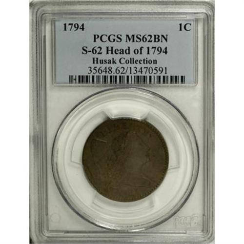 <B>1794 1C Head of '94. MS62 Brown PCGS. S-62, B-54, High R.4.</B></I> <B>Bland MS60; CC-1. Noyes AU55; CC-1. Photo #20869. Our EAC Grade AU55.<BR><BR>Equivalents. </B></I>Maris 42 (Trephined Head); Frossard 29; Doughty 62; Hays 49; McGirk 6-G; Ross 30-Z; Chapman 51; EAC 52; <I>Encyclopedia </B></I>1668; PCGS #901374.<BR><B><BR>Variety. </B></I>The lowest lock is heavy and short. Inside berry left of ONE droops down. The obverse appears on S-62. The reverse appears on S-61 and S-62. Lettered Edge, leaf points up.<BR><B><BR>Surfaces. </B></I>A perfect candidate for AU58 if we were using that grade. A remarkable coin with light brown surfaces and splashes of lighter tan and darker brown. A few minor planchet marks can be seen on each side, remaining from the original planchet prior to striking. A couple of insignificant marks are visible on Liberty's cheek. A long vertical line of lamination from the border right of Y crosses Liberty's face to the upper end of the pole. At first glance, the lamination easily resembles a die crack.<BR><BR><B>Die State II.</B></I> The obverse has a heavy rim break at 8 o'clock to 9 o'clock, typical of most known examples. Walter Breen estimates that 80% of the known examples have this rim break; we believe it is closer to 90%. Close inspection reveals faint traces of border dentils on the top surface of the rim break! We believe this feature has gone unnoticed in the past.<BR><BR><B>Appearances. </B></I>The obverse is illustrated in Noyes (1991). The obverse and reverse are illustrated in Noyes (2006).<BR><BR><B>Census. </B></I>The finest known S-62 by a large margin. Second finest grades just VF35 per Noyes, or XF40 per Bland. Sheldon was unaware of this specimen, even though it was known long before his references were published.<BR><BR><B>Commentary. </B></I>Like a number of pieces in the Husak Collection, this S-62 cent has been known for nearly 100 years but has never before been available for public competition in a coin auction. It has only had seven owners since John Work Garrett acquired the coin in the early 20th century.<BR><BR><B>Provenance. </B></I><I>John Work Garrett; Johns Hopkins University (privately, 3/1973); John W. Adams (11/1974); R.E. Naftzger, Jr. (2/1992); Eric Streiner (4/1992); Dr. Allen Bennett.</B></I><BR><BR><B>Personality. John Work Garrett</B></I> was born May 19, 1872, and died June 26, 1942. Like his brother, he graduated from Princeton in 1895. He worked in the diplomatic service until his retirement in 1933. He donated his coin collection to Johns Hopkins University where it remained until being deaccessioned and sold at public auction in a series of four sales from 1979 to 1981, held by Bowers and Ruddy Galleries.<BR><BR><b>Shipping:</b> Coins & Currency (<a target="_blank" href="http://www.heritageauctions.com/common/shipping.php">view shipping information</a>)